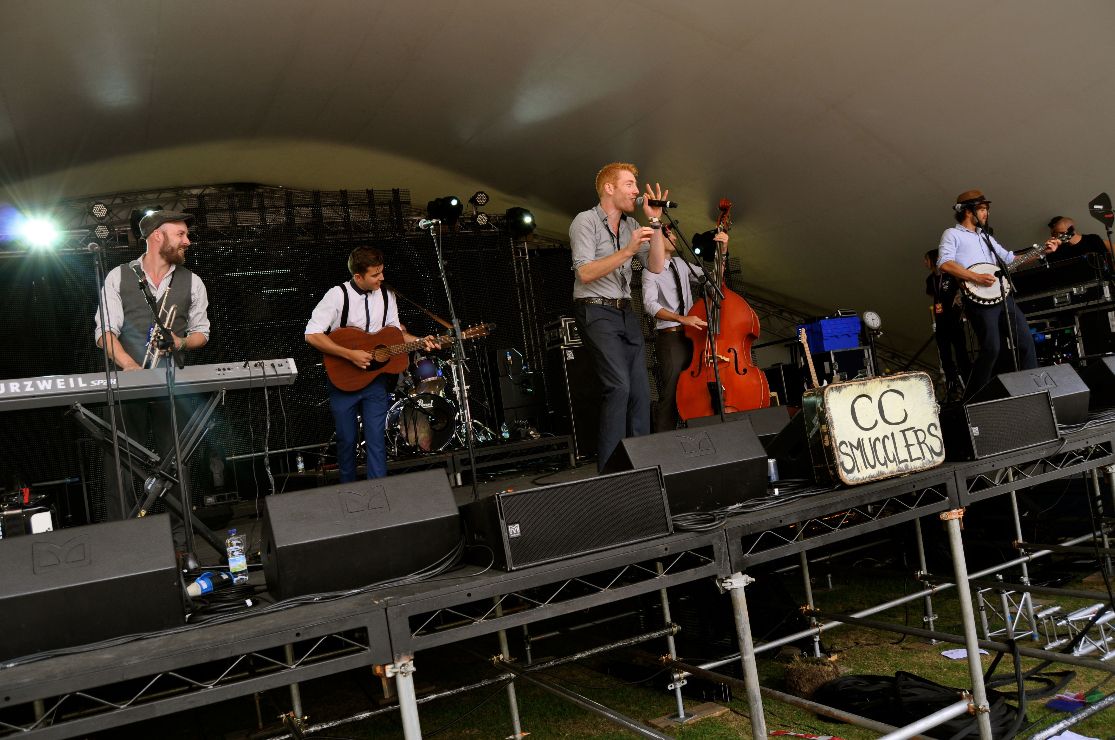 Beschreibung: Die Band CC Smugglers beim Rhythms of the World Festival in Hitchin, Hertfordshire, England