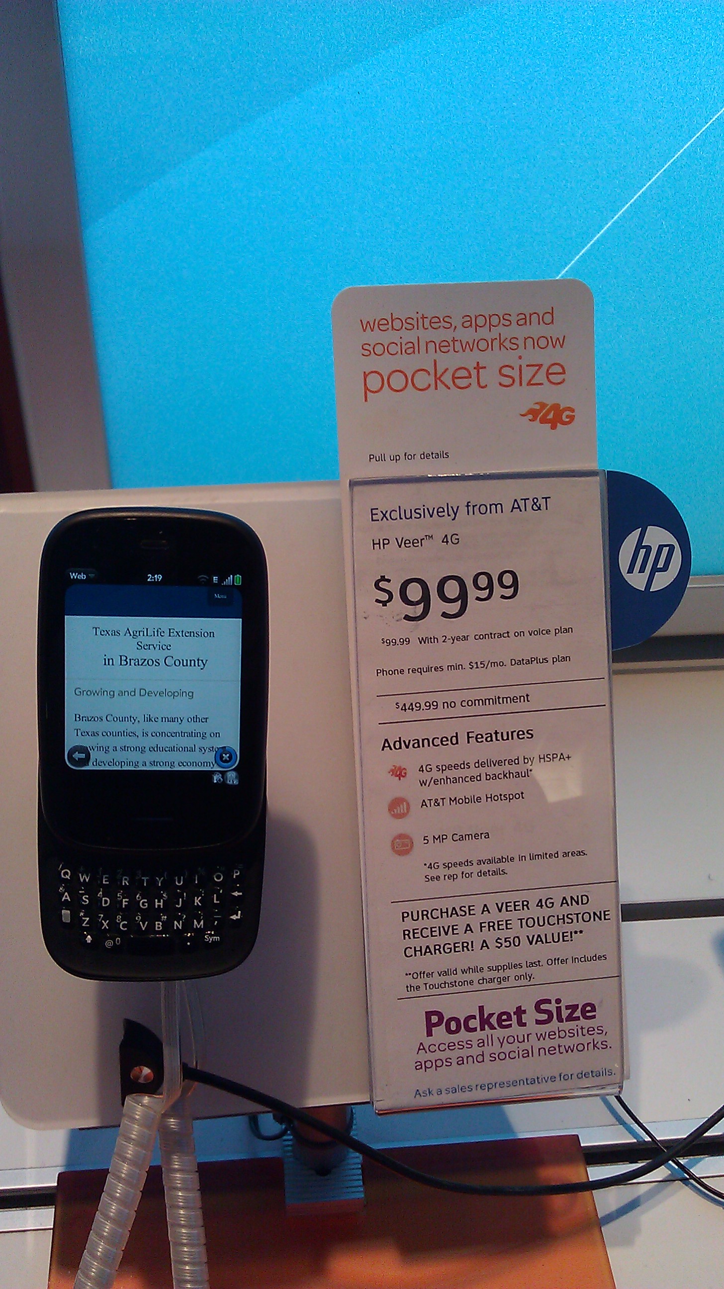 Beschreibung: HP Veer mit Webbrowser und ausgezogener Tastatur