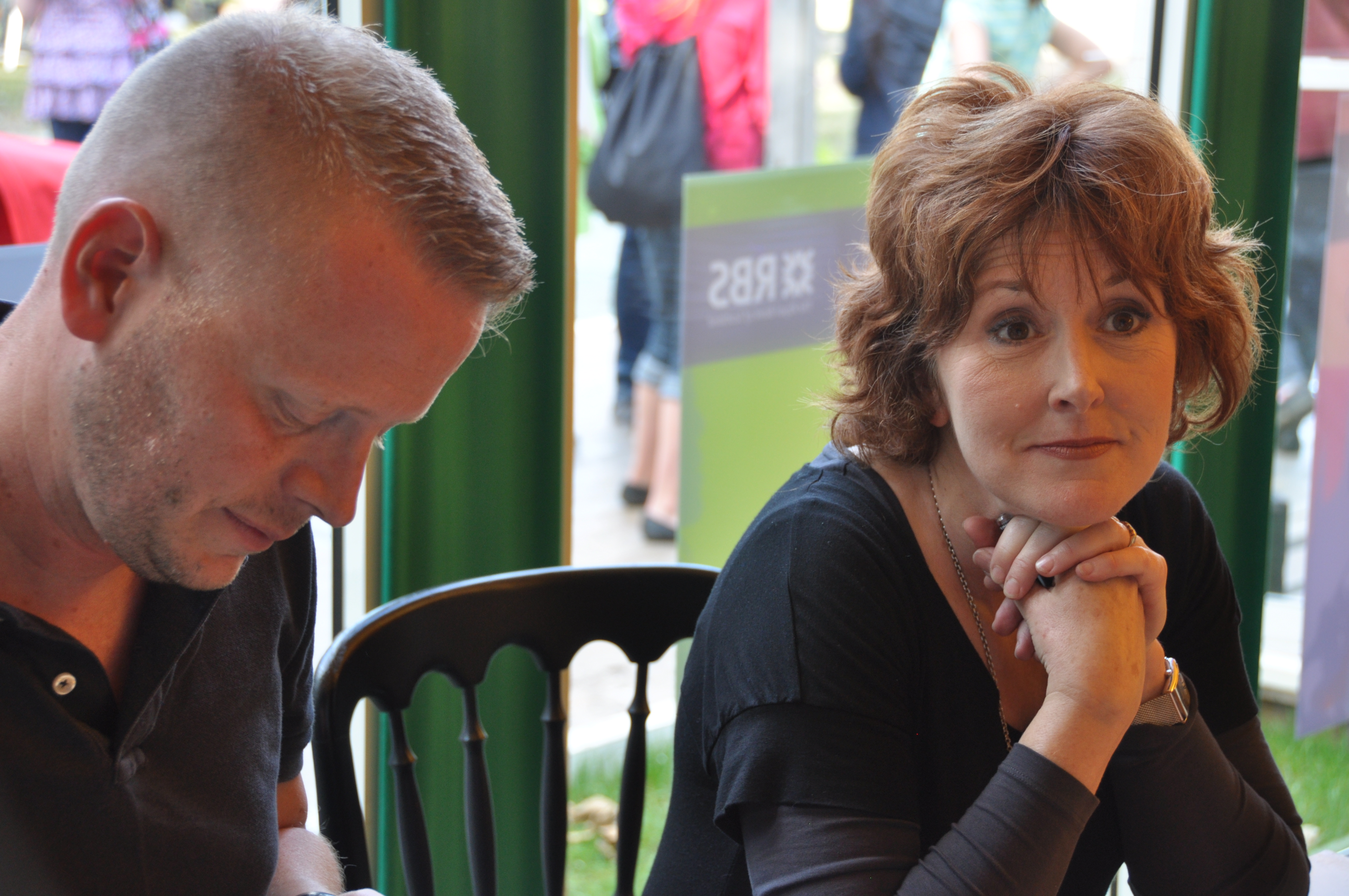 {{Information |Beschreibung = Der US-amerikanisch-britische Journalist und Schriftsteller Patrick Ness und die kanadische Autorin Moira Young |Quelle = https://www.flickr.com/photos/9014509@N06/6069006904/sizes/o/ |Urheber = …